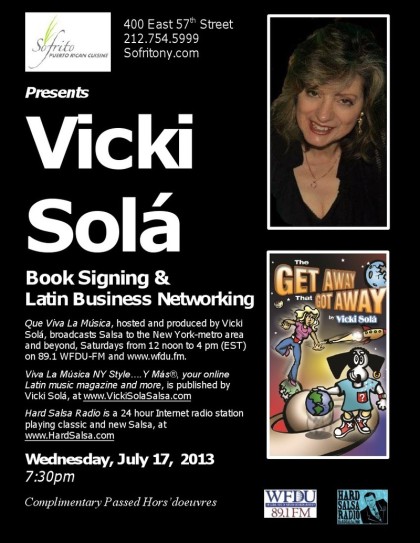 Vicki Solá will be signing copies of The Getaway That Got Away on Sunday, July 21st, from 12 noon to 8 p.m. at The Quenepa Dance Festival, held at the Plattduetsche Park Restaurant, 1132 Hempstead Turnpike, Franklin Square, NY 11010. Featured entertainment: Típica 73, celebrating their Fortieth Anniversary and featuring Adalberto Santigo, plus Choco Orta & Orchestra, Bronx Charanga, and spin doctor DJ José. For info and advance tickets, contact Tiny at 718-792-4294 or Annie at 718-829-4519.